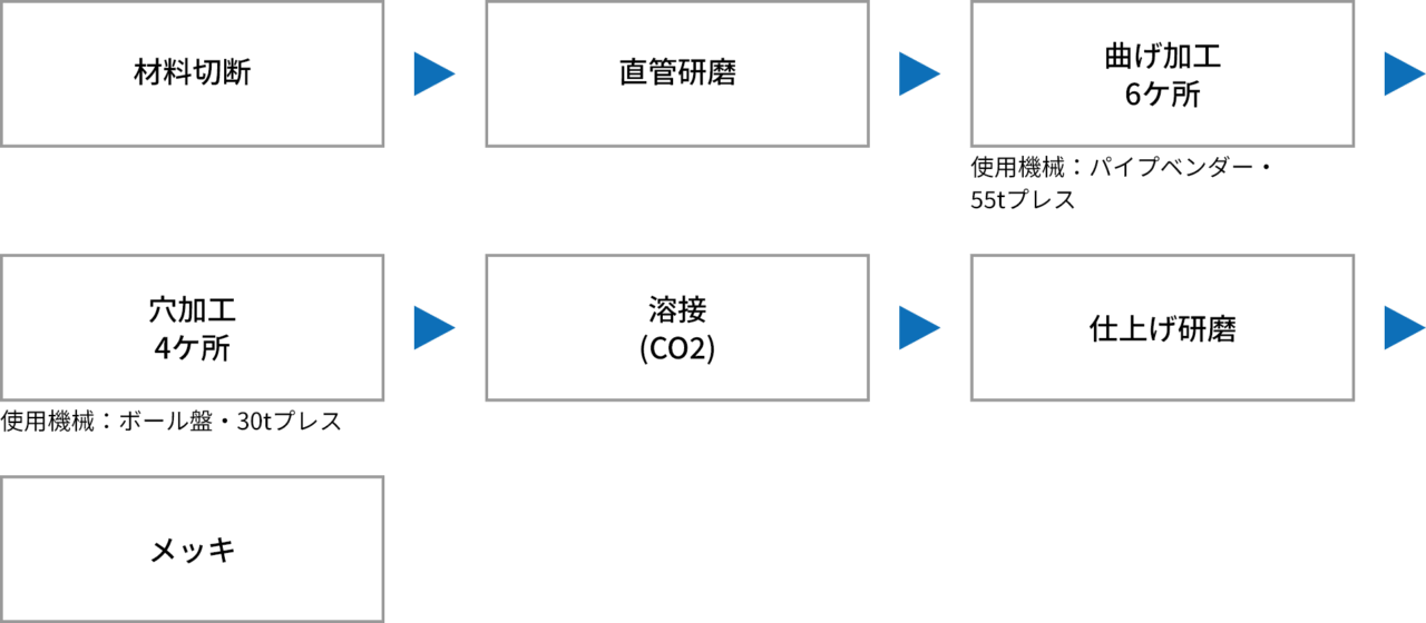 鉄パイプ(STKM11A、SPHC)と鉄板(STPG)の加工で、鉄パイプ部分は、曲げからの曲げ加工で直線がほぼ無い仕上がりが特長です。